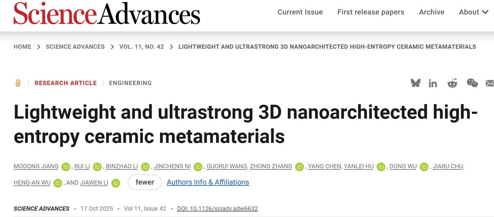 该技术攻克了高熵陶瓷在微纳尺度三维成型方面的难题,为多元陶瓷微纳器件的开发与应用开辟了新路径。相关研究成果以“Lightweight and ultra-strong 3D nano-architected high entropy ceramics metamaterials”为题发表在《科学·进展》上。工程科学学院博士生蒋谟东、博士后李瑞和硕士生李滨兆为论文共同第一作者,李家文教授为通讯作者。